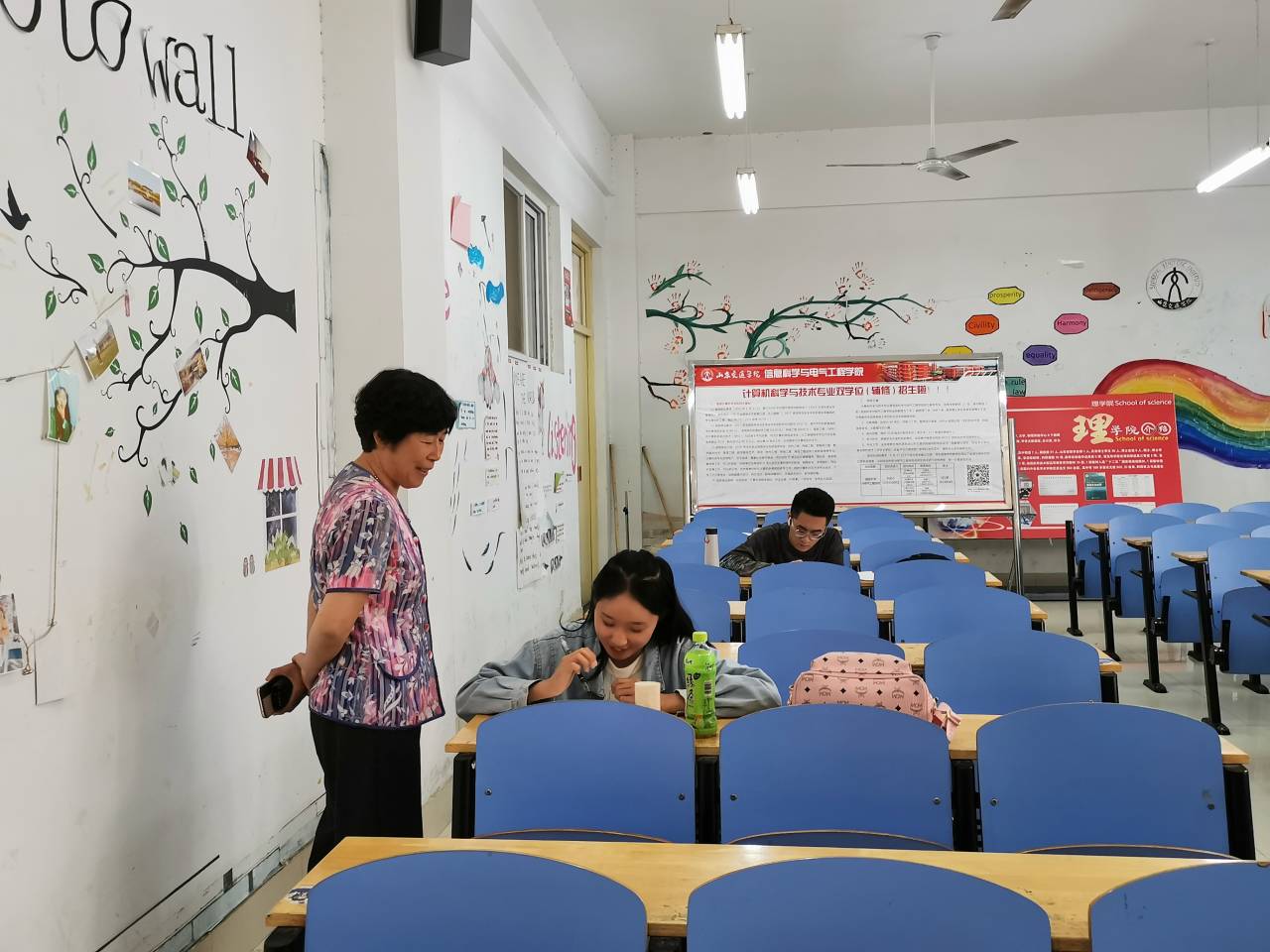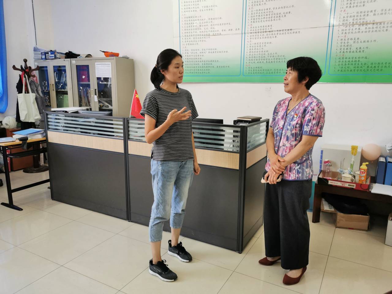 10月3日,党委书记孙秀丽随机检查了二级单位国庆假期值班情况与安全工作。在每个值班点,孙秀丽与现场值班人员进行亲切交流,了解假期学生去向,并详细了解留校学生情况。孙秀丽还随机检查了教室卫生情况,并与上自习的学生亲切交流,详细了解他们的生活学习情况,鼓励他们好好学习专业知识,将来为国家发展作贡献。