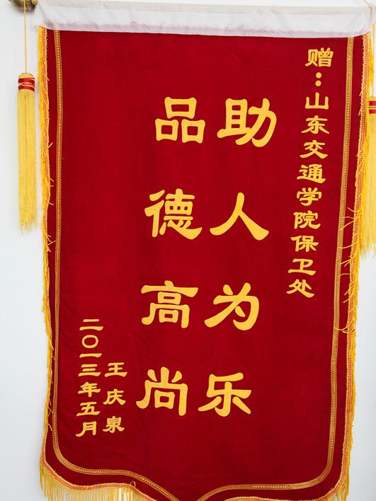 近日,齐河县居民王庆泉为我校保卫处送来了“助人为乐,品德高尚”的锦旗,对我校保安队员济危扶困的行为给予表扬和感谢。