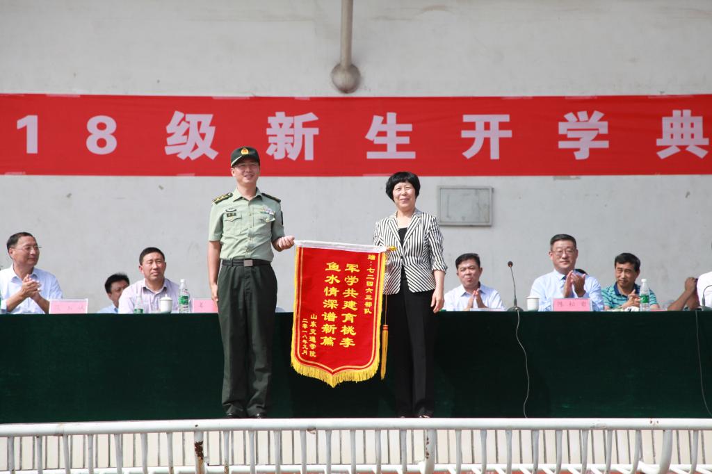 孙秀丽代表学校向承训部队赠送锦旗,表达了全校师生员工对承训部队官兵的感谢。