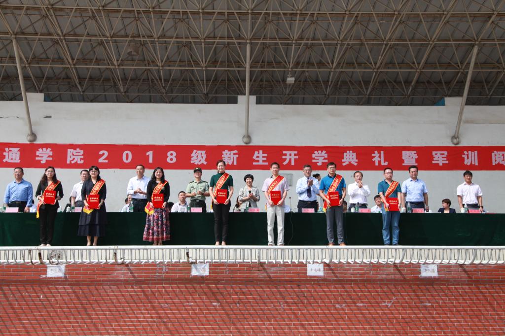 唐勇宣读《中共山东交通学院委员会关于表彰师德标兵的通报》和《关于表彰2018级新生优胜连队、军训标兵的通报》,在主席台就坐的领导向受表彰的先进集体和个人颁发荣誉证书。
