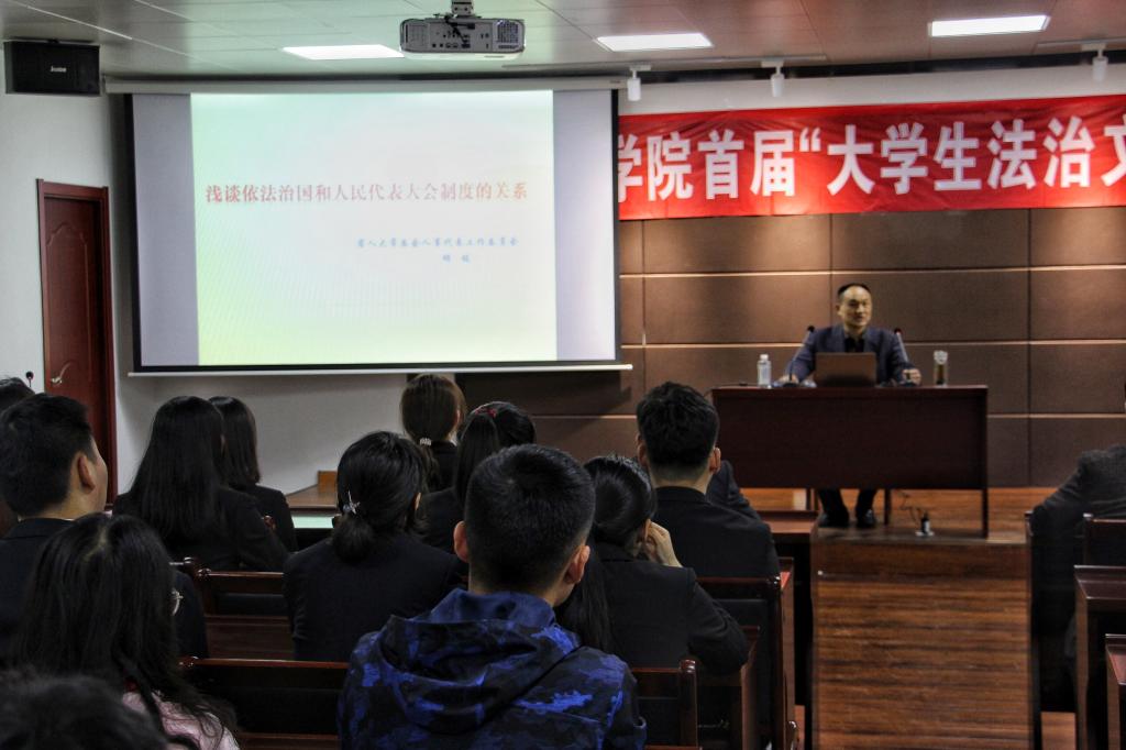 揭牌仪式结束后,明铭为我校师生举办了成长论坛62讲、文化节法律大讲堂第一讲——《浅谈依法治国和人民代表大会制度的关系》。他从依法治国的时代背景切入,结合自身参加“两会”的经验,阐述了人民代表大会制度的产生及发展,加深了同学们对人民代表大会制度的理解。