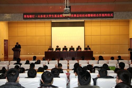 12月17日,由共青团山东省委员会、山东省学生联合会主办、青岛银行股份有限公司济南分行协办的青岛银行•山东省大学生基金模拟专项竞赛总结活动暨银校合作签约仪式在我校长清校区学术报告厅隆重落幕。团省委副书记陈必昌,团省委学校部部长郑思洁,青岛银行济南分行行长潘丽宏,青岛银行济南分行副行长刘同刚;院长鹿林,党委副书记、纪委书记唐勇出席活动,我校财经学院负责人、团委负责人、参赛院校代表及近500名参赛学生参加了仪式。仪式由学校团委书记闫淼主持。