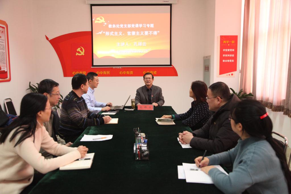 12月12日上午,教务处党支部在长清校区办公楼机关分党委党员活动室开展专题学习。学校党委委员、副院长孔祥云讲授了“形式主义官僚主义要不得”的专题党课。教务处党支部书记肖海荣主持学习活动。