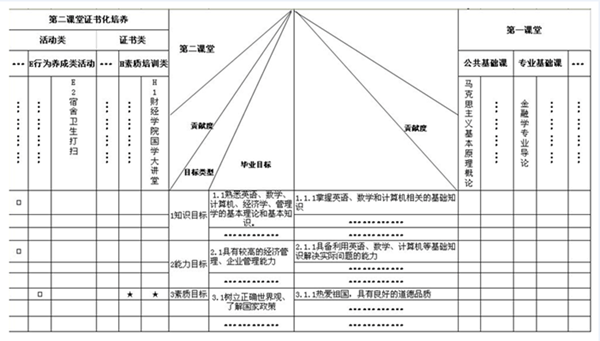 课程体系、课余活动、自我教育是人才培养的时空组合,共同完成人才培养的任务。以金融学专业为例,围绕着人才培养目标定位的分解,形成了熟悉专业英语、管理学、投资理财、经济素养等等许多指标,如何实现这些指标,有了第一课堂、第二课堂、自我教育的内容,清晰了各部分的要求构成。虽然各自内容不同、培养方式各异,但交互作用于青年学生的成长过程。整个体系更加强调了围绕着专业能力培养,优化配置培养资源。