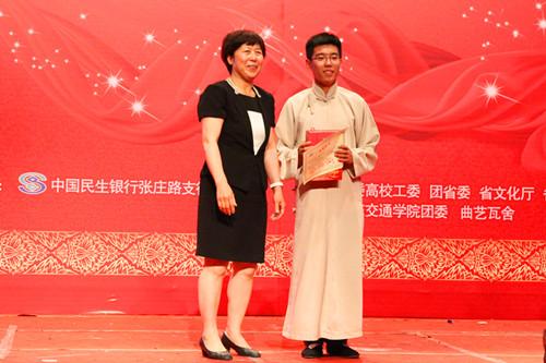 颁奖晚会上,孙秀丽发表了热情洋溢的致辞。她首先代表学校对大家的到来表示热烈的欢迎,并简要介绍了学校的基本情况。她在讲话中指出,学校一直高度重视传统文化的教育和传承,较好地发挥了学生社团在校园文化建设中的生力军作用,“诚信驿站爱心”团队在校园内外树起了遵诚守信的风向标,“曲艺瓦舍”做为全省十大优秀学生社团,常年参加电视台节目录制和曲艺专场演出,“诚信剧场-周末相声俱乐部”先后有50多位曲艺名家前来献艺。以喜闻乐见的形式开展传统文化教育,已经成为山东交通学院校园文化活动中不可或缺的组成部分。孙书记强调,此次大赛的举办,是全省大学生社团活动的一件盛事,是集中展示大学生青春风采的良好契机,是立足优秀传统文化,弘扬社会主义核心价值观体系的有效载体。看曲艺,学曲艺,是大学生提高修养与内涵的重要途径;欣赏优秀民族艺术,弘扬传统文化,是时代青年建设文化强国、实现民族复兴的神圣使命。希望广大同学以此次比赛为契机,共同品味曲艺的独特魅力,领略中华民族传统文化的璀璨光彩。