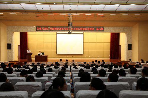 杨占辉以《中共中央关于全面深化改革若干重大问题的决定》中第42条 “深化教育领域综合改革”内容为切入点,围绕“社会主义核心价值观的发展历程、时代特点”、“全面深化改革的提出背景、主要特征和实践进程”、“在改革创新中积极践行社会主义核心价值观”三个方面展开论述。在山东省全面深化改革实践进程方面,杨占辉特别指出山东教育改革发展的工作重点:全面实施素质教育,立德树人贯彻教育全过程;优化义务教育资源配置,完善义务教育均衡发展机制;加快现代职业教育体系建设,建立职业教育人才贯通培养的立交桥;推进省属本科院校向应用型本科教育转型,创新高校人才培养模式;深入推进管办评分离,不断完善学校内部治理结构;推进学前教育、特殊教育、继续教育发展;加快推进考试招生制度改革。