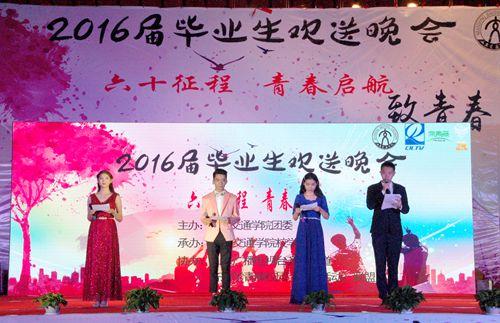 晚会以“六十征程,青春起航”为主题,分“恣意青春年华”、“六十风雨同舟”、“携手共度遥程”三个篇章。第一篇章中:歌曲《最美的太阳》激励大家抱梦前飞;小品、乐器合奏、歌曲串烧节目追忆了青春年华。第二篇章中:民谣合奏、舞蹈萨克斯伴舞演绎了交院学子的青春风采;诗朗诵《回首青春,筑梦未来》带领我们领略了学校建校六十年来桃李满天下的辉煌;韵律十足的歌曲串烧《只要你过得比我好》、《往日时光》、《朋友》让毕业生一起追忆了大学时光的美好。第三篇章中:歌曲、相声节目表达了对学校的美好祝愿;大合唱交院版《不说再见》唱出了青春不散场的节拍,表达了毕业生向学校六十年华诞献礼的深情。