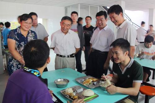 调研期间,李军书记专门深入学生餐厅,仔细查看餐厅就餐环境,与餐饮工作人员亲切交谈,了解菜品种类、饭菜价格、经营情况,并与就餐学生亲切交流,详细询问对饭菜价格、饭菜质量、就餐环境的意见和建议,表示学校将认真对待同学们的意见和建议,不断提高饭菜质量,稳定饭菜价格,保证食品安全,让同学们吃得放心,吃得满意。最后,李军书记亲自排队、刷卡买饭,与师生共同就餐。