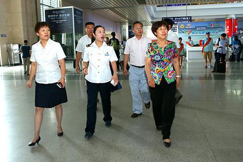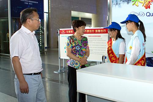 在济南西站,孙秀丽、唐勇一行慰问了我校坚持在暑运一线的大学生志愿者,了解了志愿者的工作情况,亲切询问了大家的身体状态,对大学生志愿者的工作给予了充分肯定。孙秀丽一行还与西站站长张妍等进行了交流。孙秀丽感谢西站长期以来对我校广大青年志愿者们的信任和支持,她在讲话中指出,参加支援高铁动车客运工作是学校开拓社会实践资源和学生自我锻炼成长的有效途径,希望同学们秉持志愿服务精神,利用暑假社会实践多接触社会,虚心向群众学习,在实践中锻炼能力、提高素质,将社会主义核心价值观内化于心,外化于社会服务的实践中,展现大学生的青年风貌。张妍对我校大学生志愿者3年来在构建和谐暑运中表现出的社会责任感和使命感给予了高度赞赏。双方还探讨了校地共建形势下构建青年志愿服务长效机制和可持续发展的模式。