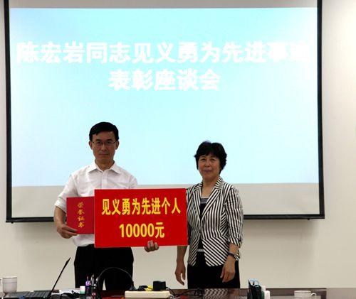 会上,孙秀丽为陈宏岩颁发了荣誉证书和奖金。