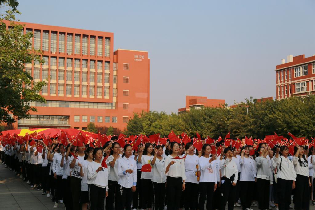 活动最后,全体人员齐唱《我和我的祖国》。在校国旗护卫队的带领下,长清校区2019级全体新生将一面巨型国旗双手托起,由学校图书馆一路向东,缓缓传递至“不忘初心 、牢记使命”主题雕塑,以此表达全校师生对祖国的爱国之情、报国之志。