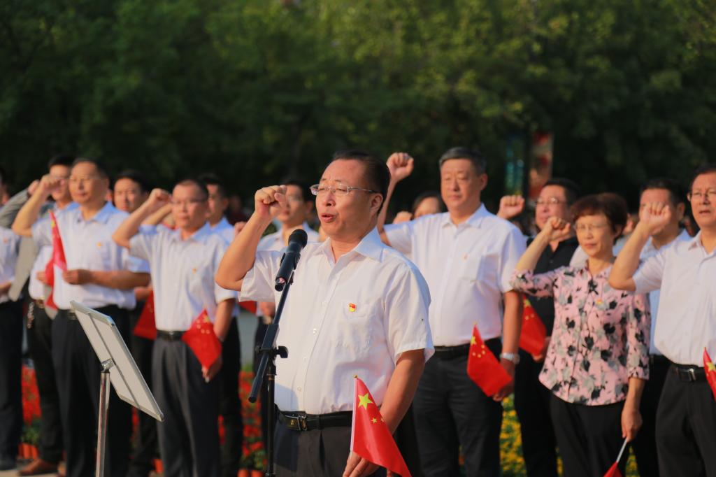 全体党员在学校党委副书记唐勇的带领下,面对党旗,庄严举起右手,共同重温入党誓词。