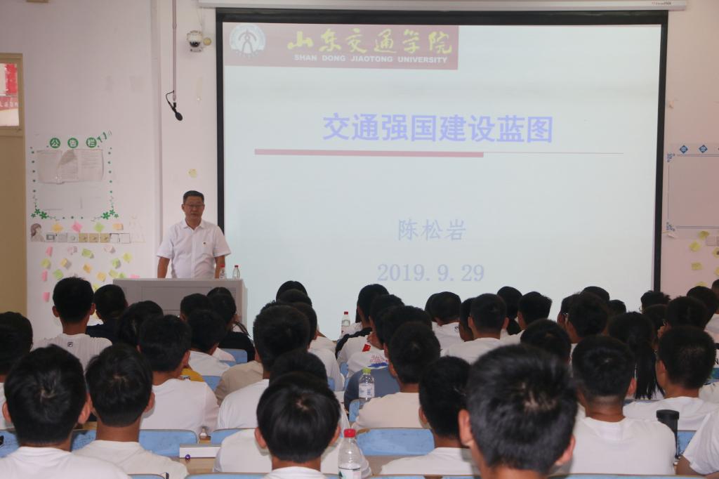 9月29日,陈松岩来到轨道交通学院2019级新生的思政课课堂,结合新中国交通建设成就重点解读了国家新近颁布的《交通强国建设纲要》,与同学们分享了未来交通强国建设蓝图。他表示,建设交通强国是以习近平同志为核心的党中央立足国情、着眼全局、面向未来作出的重大决策。他寄语同学们要树立崇高的理想抱负,勇于担当建设交通强国大任。