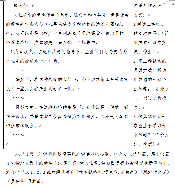 假如有这么一门课《竞争优势》(迈克尔.波特 著),是某专业的核心课程之一,该课程在课程体系中的任务、与其它课程的逻辑关系等可以用几个表呈现,包括:《课程内容对可考核指标点的支撑矩阵》、《课程预期学习成果实施计划》、《毕业要求达成度评价表》等等,(由于该课程是虚拟的例子,就难以列出有关的列表,在此略去各表内容)。该课程共4篇,15个指标点,60个知识点。课程的展现是将全部内容都展示出来,如果截图指标点1:“核心概念”中的知识点2:“基本竞争战略”,基本内容如下: