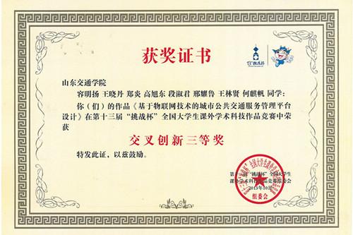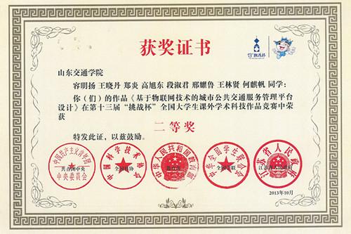 10月17日晚,由共青团中央、中国科协、教育部、全国学联和江苏省人民政府主办的第十三届“挑战杯”全国大学生课外学术科技作品竞赛在苏州大学落下帷幕。由我校管理学院教师张雪军指导、学生容明扬、郑炎、王晓丹、段淑君、王林贤、何麒帆及信电学院学生高旭东、交通与物流工程学院学生邢耀鲁共同完成的《基于物联网技术的城市公共交通服务管理平台设计——智慧公交》项目获得全国二等奖。这也是我校自参加全国大学生“挑战杯”活动以来获得的最高奖项。另外,该项目团队成员来自三个学院三个年级的学生,涵盖六个专业,以学科专业结构合理、创新性和应用性强而被评为“交叉创新”三等奖。决赛期间,我校参赛作品得到了各界代表和社会媒体的肯定和关注。山东团省委副书记陈必昌、山东团省委学校部部长郑思杰亲临我校展台,对我校参赛作品给予了高度评价。
