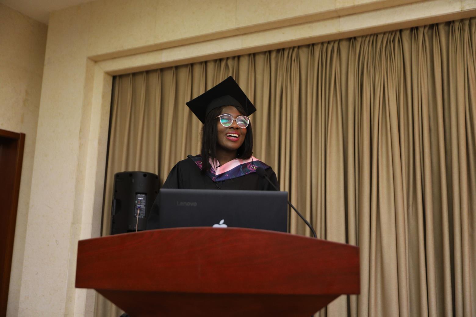 三名毕业生代表向学校捐赠毕业生集体制作的礼物,并代表所有毕业生向辛勤培养和教育他们的全体老师表达了深深的感谢。科特迪瓦籍毕业生玛丽表示,作为交院人,她会让世界上更多的人了解文明中国,了解泉城济南,了解山东交通学院,为中外的友好交流做出贡献。