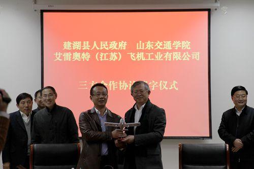 孙云早代表学院与建湖县副县长陈魏亮、江苏蓝天航空航天产业园董事长兼艾雷奥特飞机(江苏)飞机工业公司董事长签署了三方人才基地建设框架协议。