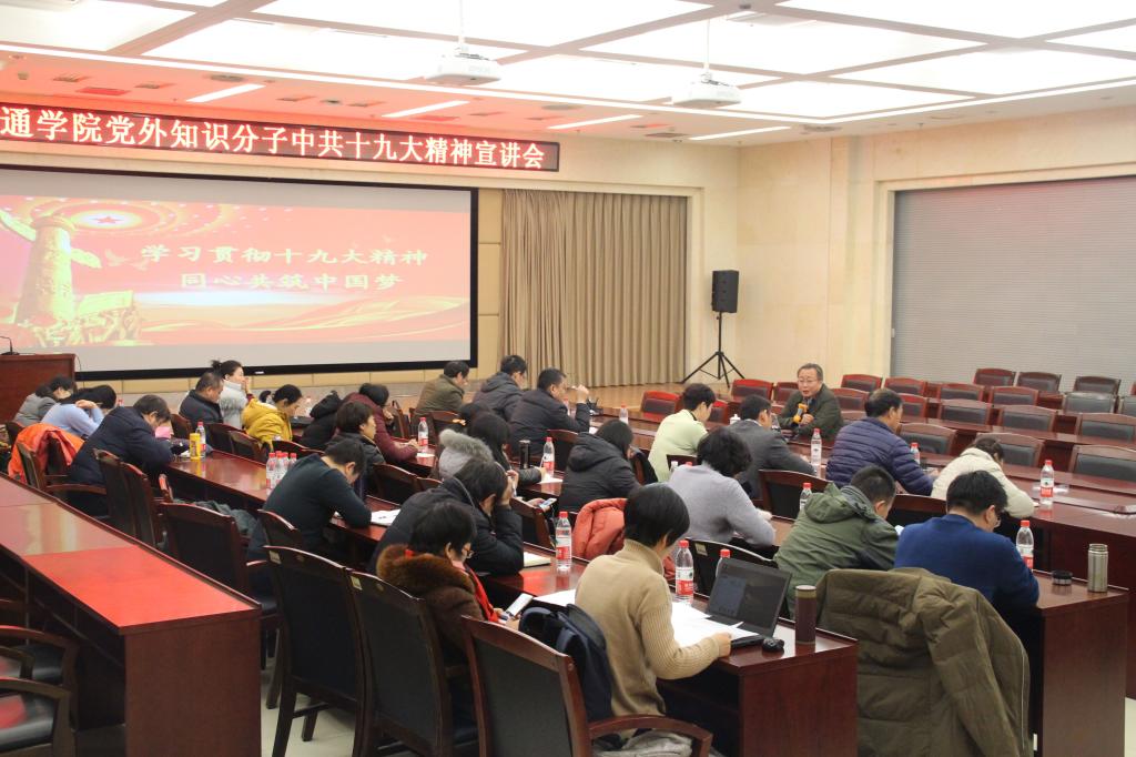 按照学校党委部署安排,12月15日,党委统战部面向全校党外知识分子在学术报告厅会议室举办中共十九大精神宣讲会。党委副书记、学校党的十九大精神宣讲团副团长唐勇宣讲。党委统战部全体人员、各二级学院分党委统战委员,学校各民主党派成员、无党派知识分子联谊会会员参会。会议由党委统战部部长娄进举主持。