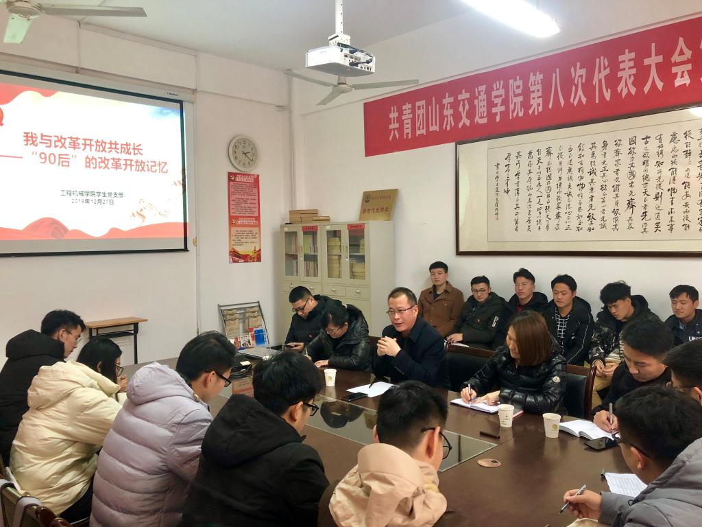 12月27日下午,学校党委委员、副院长李贞涛在长清校区1号教学楼党员活动室为工程机械学院学生党员讲授《形势与政策》课。课程以“我与改革开放共成长——‘90后’的改革开放记忆”为主题,工程机械学院学生工作负责人和各学生党支部书记一同聆听了本次课程。