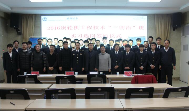 1月12日,威海校区2016级轮机工程技术“三明治”班实习选岗签约仪式在威海校区多功能厅举行,副院长姜华平、威海海事局船员处处长王洪亮,上海中船有限公司总经理刘辉,青岛源丰润有限公司副总经理张建刚出席仪式。