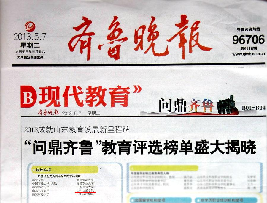 日前,齐鲁晚报发起《问鼎齐鲁——2013谁将成就山东教育发展新里程碑》评选活动。广大读者通过网络和电话两种方式为自己满意的学校和机构投票。5月7日出版的《齐鲁晚报》刊登出最终投票结果,我校在全省63所符合评选标准的本科院校中脱颖而出,当选为“年度综合实力前十强典范本科院校”。(党委宣传部)