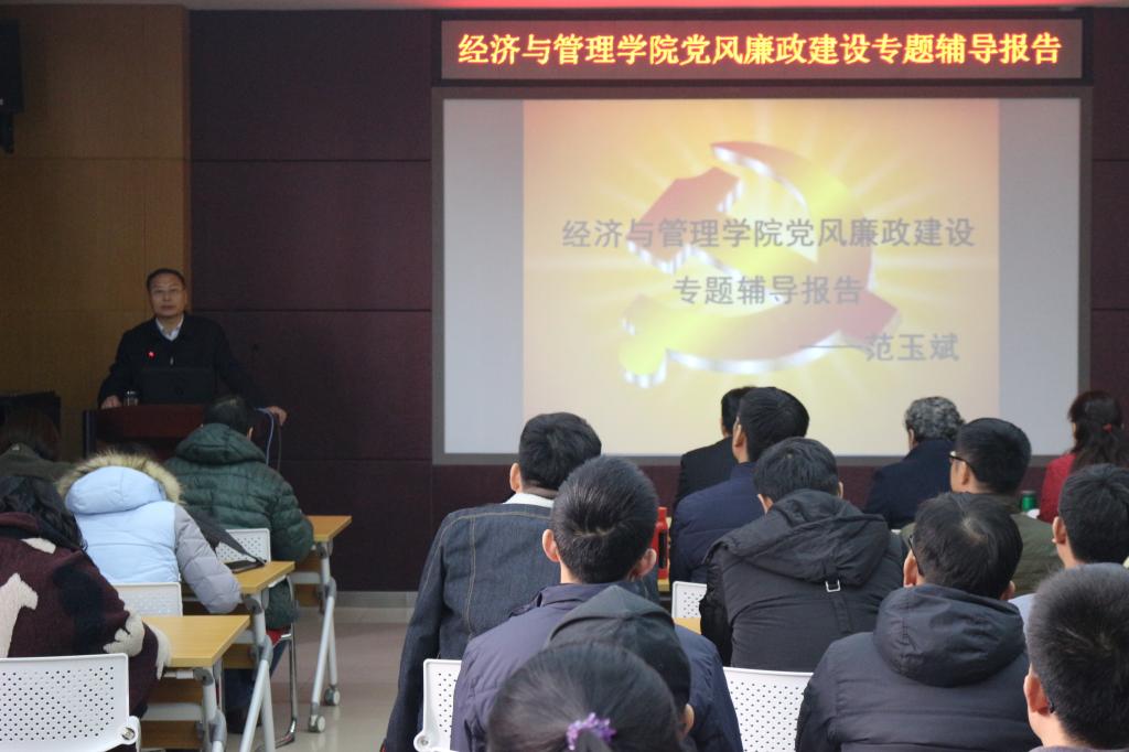 12月12日下午,经济与管理学院在长清校区1B104举办党风廉政建设专题辅导报告会,学校纪委书记范玉斌出席活动并作了题为《二级学院如何加强党风廉政建设》专题辅导报告。纪委副书记刘廷新参加活动。会议由经济与管理学院分党委书记赵中利主持。