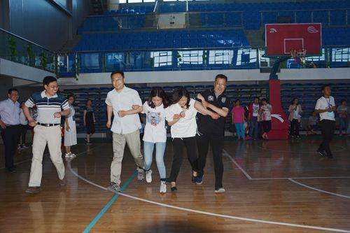 在热烈的掌声和欢快的加油声中,6位校领导组队率先完成了“6人7足跑”,他们腿绑腿、肩并肩、手挽手,喊着整齐有力的口号,大踏步地迈向前方……在场所有人都被深深感染,加油声、呐喊声、口号声、欢笑声洋溢在整个比赛现场。