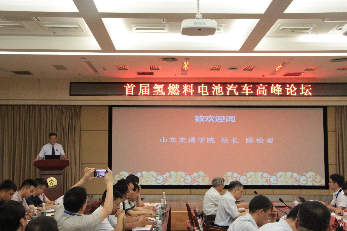 陈松岩致欢迎词,他对出席本次论坛的领导、嘉宾表示热烈欢迎。他指出,山东交通学院是山东省唯一一所培养综合交通人才的普通本科高校,学校坚持“立足山东、服务交通”的理念,紧扣行业提供交通人才支撑、对接产业进行科技创新,主动服务经济社会和交通事业发展。学校将以此次论坛为契机,更加关注以氢电池为代表的新能源发展,不断加强在新能源领域的研究,进一步促进氢燃料汽车健康快速发展,助力山东省新旧动能转换目标的实现。随后,来自浙江大学、同济大学、中国汽车技术研究中心、山东建筑大学、齐鲁工业大学、中国重汽技术中心、中通客车研究院等相关领域的知名专家学者分别作了《氢燃料电池的技术路线与应用》《氢燃料电池汽车全球最新发展动态》《中国氢燃料电池汽车产业的发展概况》《国内氢燃料电池汽车的最新发展》《氢燃料电池在商用汽车上的应用》《氢燃料电池在客车上的应用》等专题报告。与会专家表示,在氢能和燃料电池产业持续不断升温和国家的政策支持下,氢燃料电池汽车产业已具有了市场化规模。专家们共同探讨了氢燃料电池的产业化路径,结合山东省新旧动能转换的重大历史机遇,提出氢燃料电池研究的技术瓶颈及解决方案,进而推进氢燃料电池的技术提升和产业发展。