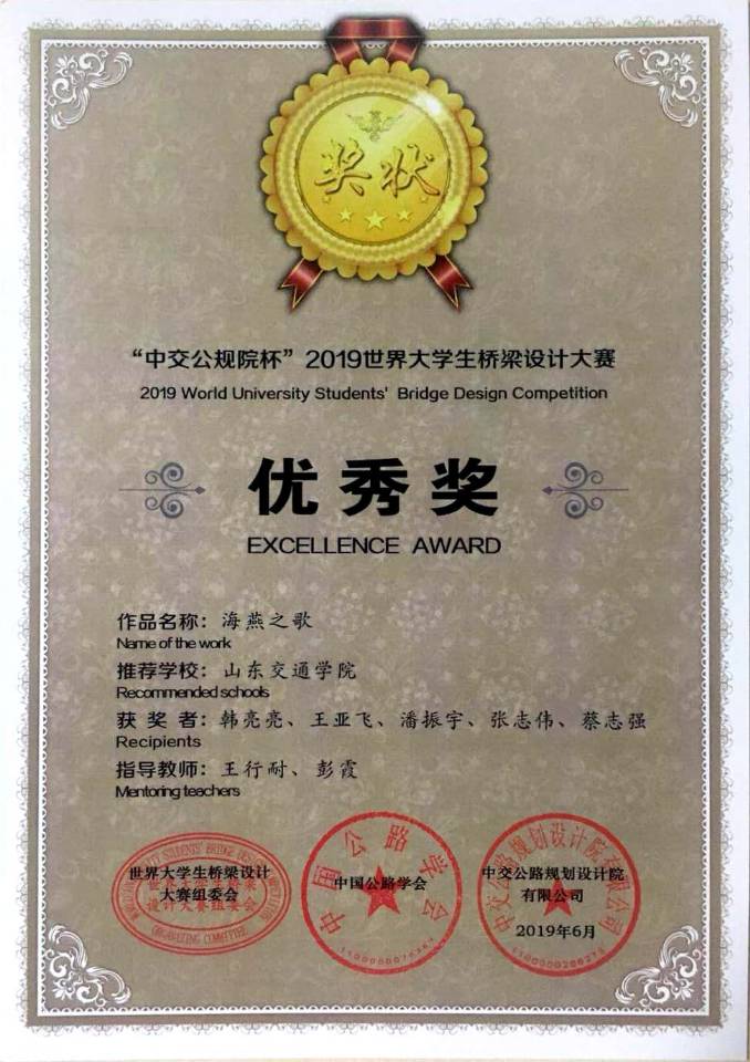 近日,“中交公规院杯”2019世界大学生桥梁设计大赛总决赛暨颁奖典礼在北京国家会议中心报告厅举行,我校交通土建工程学院王行耐、彭霞老师指导的作品“海燕之歌”荣获优秀奖。