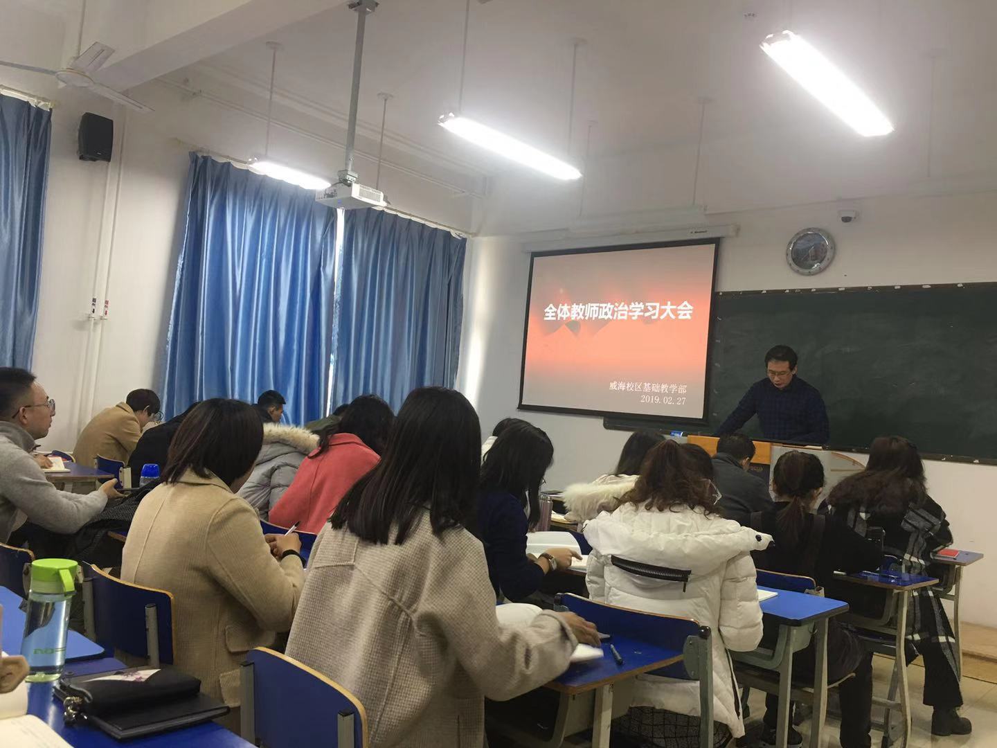 2月27日,威海校区基础教学部在2号教学楼B314召开学习贯彻全省教育大会精神会议。基础教学部主要负责人、各教研室教师共计41人参加会议。会议由基础教学部主任程向新主持。