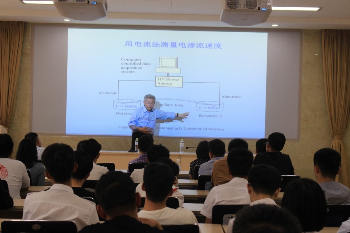 报告中,李冬青结合自己多年的研究成果,与大家分享了电动微纳流体和实验室芯片的相关理论及最新应用方向,特别是纳米通道中电动微流体传输和控制、直流电场下的介电电泳及电诱导的双面油滴等内容,并介绍了自己团队制造的全自动电动微流控实验室芯片,包括载有PCR芯片、免疫检验芯片、神经氨酸酶检测芯片和流式细胞仪等。报告结束后,李冬青与现场师生进行交流,针对老师和同学们所关注的学术创新、学术领域转换、学生培养等实际问题进行了详细解答,并在个人职业发展方面给予青年教师具体建议,在场师生纷纷表示受益匪浅。