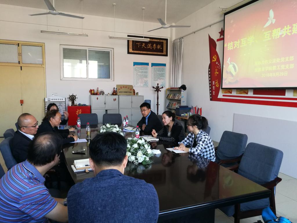 为深入学习贯彻党的十九大精神,加强基层党组织建设,提升党支部工作水平,近日,国际合作交流处党支部与国际教育学院教工党支部在长清校区2号教学楼B510会议室举行结对共建交流会。