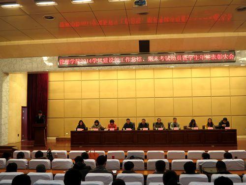 12月24日下午,管理学院全体教师及450余名学生代表汇集一堂,在我校长清校区学术报告厅召开了学风建设年工作总结、期末考试动员及年终学生表彰大会。 会上,管理学院相关负责人就2014学风建设年工作进行了总结,对学风建设年工作过程中采取的措施和学风建设成效进行了全面回顾。针对即将到来的期末考试,学院相关负责人从教师的职责和学生的义务谈起,详细部署了期末考试组织工作,重申并强调了考场纪律,号召师生共同维护考场的严肃性和诚信做人的传统美德。 大会通报了《管理学院关于对2014年度取得突出成就的学生集体和个人进行表彰的决定》,对获奖集体和个人进行了一一颁奖。颁奖现场掌声雷动,场面鼓舞人心。 大会结束后还组织了班级文化展示班歌演唱会,同时展示了他们各自班级的班徽和班训。学院40余名教师全程观看了演出并不时给同学们以热烈的掌声。(管理学院 文/杜永明 图/金璐)