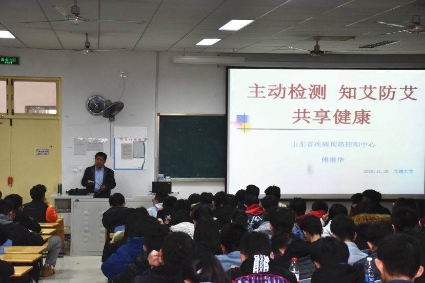 傅继华结合2018年世界艾滋病日“主动检测,知艾防艾,共享健康”的主题,讲解了中国疾控中心、联合国艾滋病规划署、世界卫生组织联合评估的我国艾滋病疫情报告,并宣讲了我国艾滋病防控政策。他全面介绍了艾滋病知识,着重强调了高校艾滋病风险和防控的关键,触目惊心的画面和数据深深触动了在场的同学们。随后,荆现华针对艾滋病检测方面的问题,与同学们进行互动。