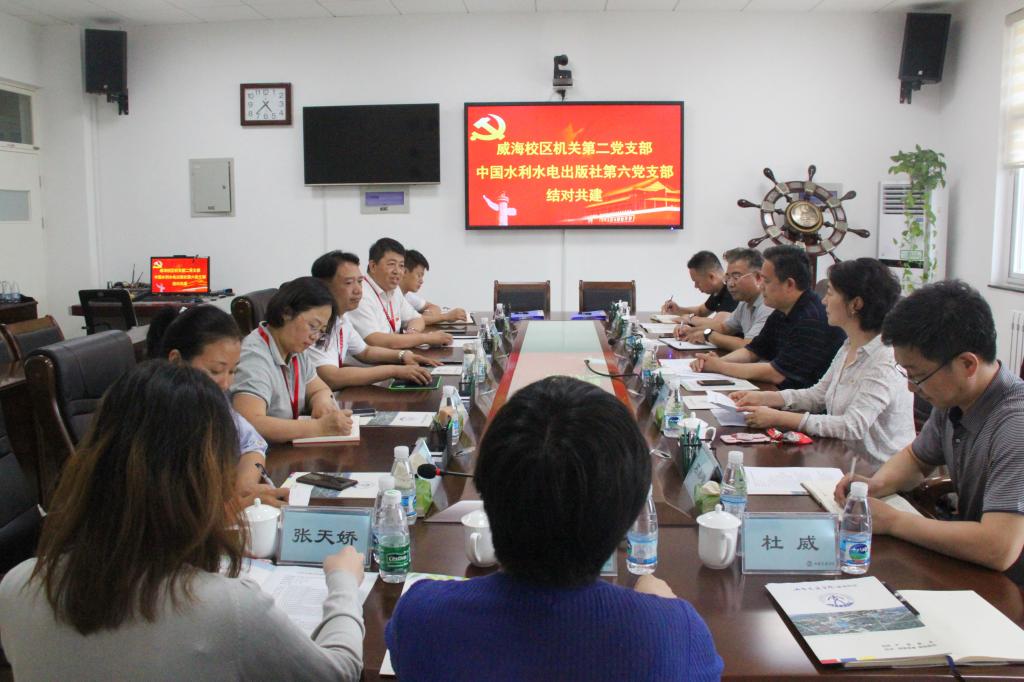 为进一步加强对外合作,交流文明单位创建经验,激发基层党建新动能,6月20日,威海校区机关第二党支部与中国水利水电出版社第六党支部在威海校区会议室开展结对共建活动。中国水利水电出版传媒集团纪委书记王厚军,万水分社社长、第六党支部书记杨庆川,威海校区党委副书记程伟渊参加活动。