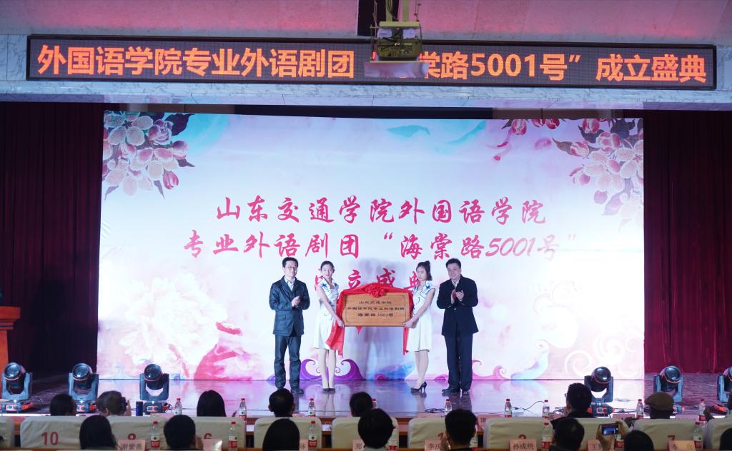 3月14日晚,外国语学院于长清校区学术报告厅举行专业外语剧团“海棠路5001号”成立仪式。党委学生工作部(处)、团委、外国语学院相关负责人,部分教师代表及300余名学生参加活动。