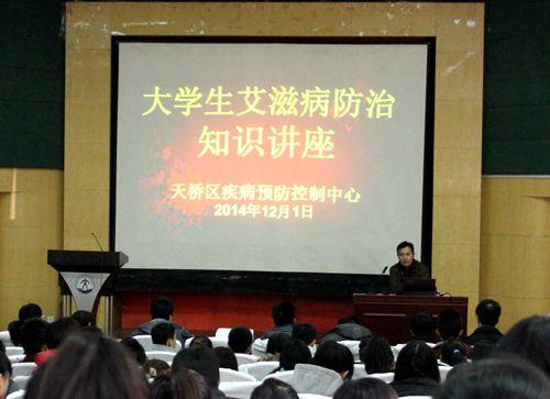 为进一步普及、宣传艾滋病防治知识,增强大学生的自我防护意识,12月1日,在 “世界艾滋病日”到来之际,济南市天桥区疾控中心和学校医院工作人员为我校无影山校区2014级新生联合举办了“防艾”知识讲座。 讲座中,天桥区疾控中心专业工作人员通过图文并茂的形式为2014级新同学讲解了什么是艾滋病,艾滋病的传播途径,艾滋病的“四免一关怀政策”,艾滋病对个人、家庭、社会的影响和危害,高危人群如何防治艾滋病以及感染了艾滋病应该如何处理等相关知识。活动展出宣传画20幅,发放宣传资料300余份。学生们认真学习和讨论了艾滋病防治的相关知识,增强了对艾滋病的防护意识和自我保护意识。(后勤管理处 校医院 文图/刘毅)