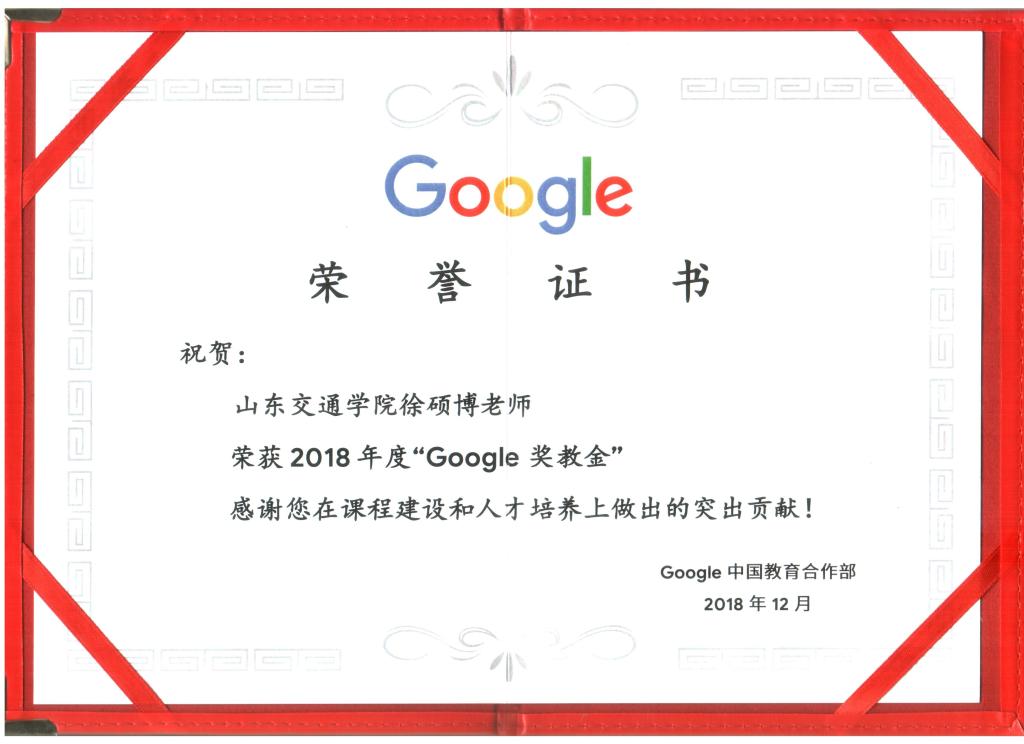 近日,2018年度Google评审委员会在全国高等院校范围内评选出15名获奖教师,我校信息科学与电气工程学院教师徐硕博获得2018年度Google Faculty Award (Google奖教金)。