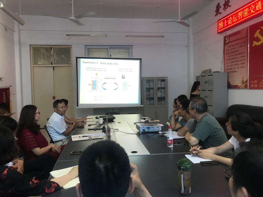 董德华介绍了陶瓷膜的背景及其在工业分离和高温能量转换中起到的重要作用,包括气体分离、工业催化、高温固体氧化物燃料电池和电解电池。他指出,陶瓷的微结构对工作效率与稳定性有重要影响,讲解了一种新型微通道陶瓷膜的制备方法及其在固体氧化物电池中的应用。微米尺度的通道均匀地分布在陶瓷膜的截面上,从膜的一侧开孔,终结于膜另一侧的分离层或功能层。通过微通道提高气体在陶瓷膜中的扩散速度,从而提高从空气中分离氧的速度、燃料电池的发电效率、电解池中氢气产率和CO2还原效率。报告结束后,师生代表与董德华进行了深入交流。