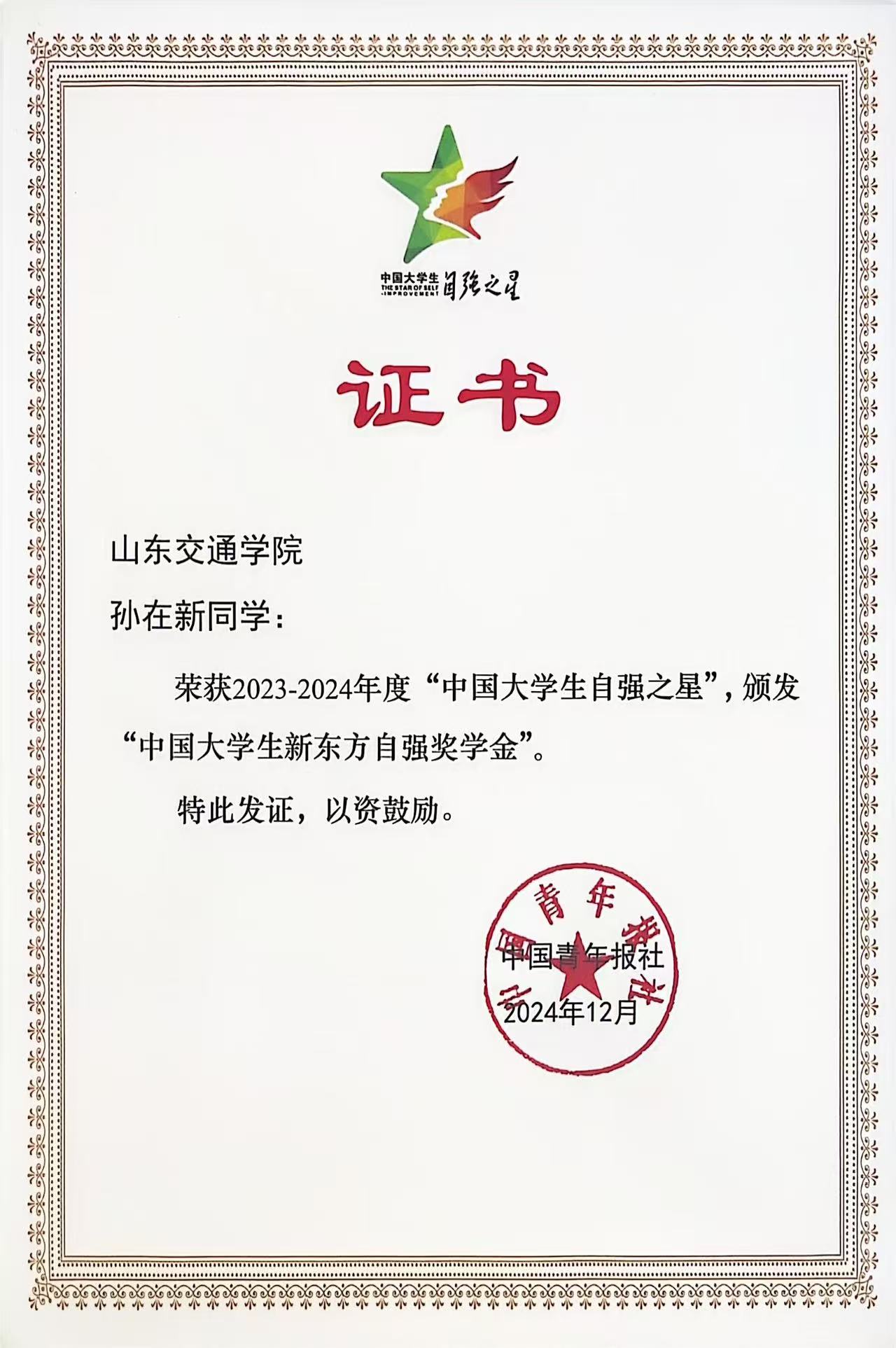 近日,2023-2024年度“中国大学生自强之星”奖学金推报活动结果揭晓。我校工程机械学院学生孙在新荣获2023-2024年度“中国大学生自强之星”和“中国大学生新东方自强奖学金”。