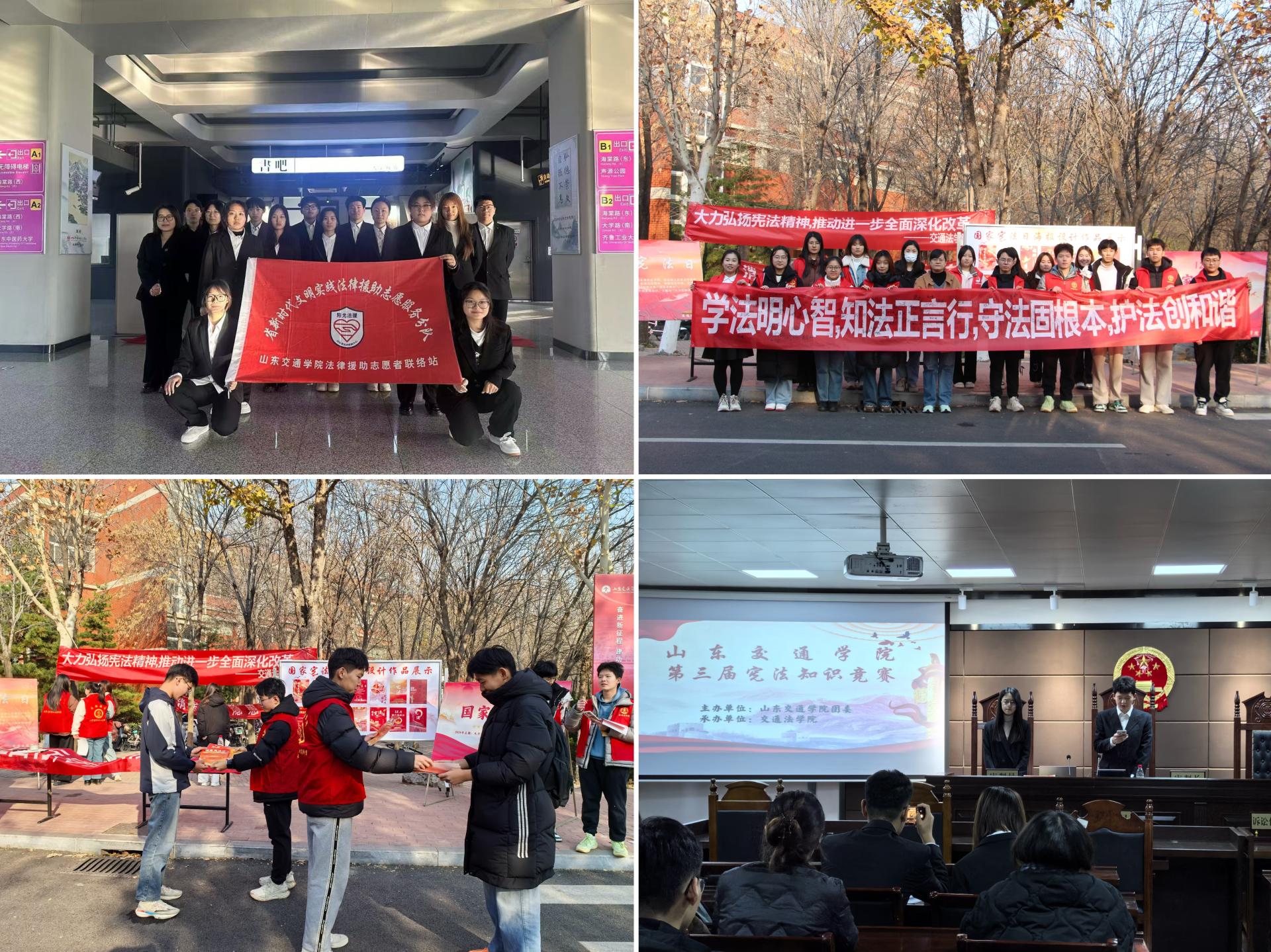 交通法学院开展“国家宪法日”普法宣传系列活动。在校外,学院联合济南轨道交通集团有限公司在各个地铁站开展宣传活动,学院党委书记闫淼、济南轨道交通集团有限公司法务风控部部长韩树功参加活动。学院师生通过发放宣传册、设置面对面咨询服务台、提供现场法律咨询等方式宣讲宪法法律知识;在校内,学院开展宪法诵读活动,同学们共同诵读《宪法》部分条款,观看主题宣传片《照耀》,在普法宣传横幅上签名。开展校内宣传活动,学院师生在一号餐厅门口,通过展板展示、发放宣传单、悬挂横幅等多种形式,普及宪法知识,推动宪法精神深入人心。开展第三届宪法知识竞赛和国家宪法日主题海报设计比赛,在寓教于乐中引导学生尊崇宪法、学习宪法、遵守宪法,为法治中国建设汇聚青年力量。
