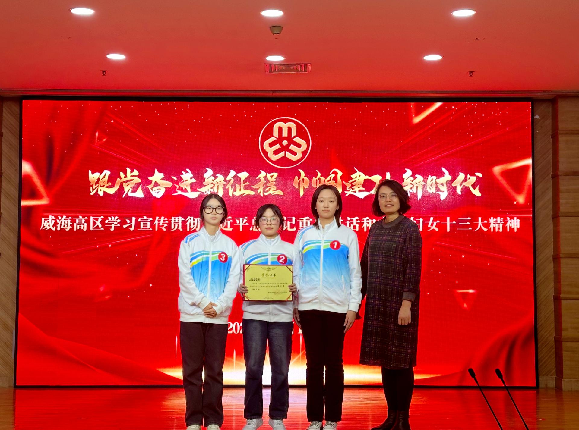 12月15日下午,威海市高区妇联“跟党奋进新征程 巾帼建功新时代”学习宣传贯彻习近平总书记重要讲话和中国妇女十三大精神知识竞赛在威海市高新大厦报告厅举行,我校代表队在决赛中获得第三名。
