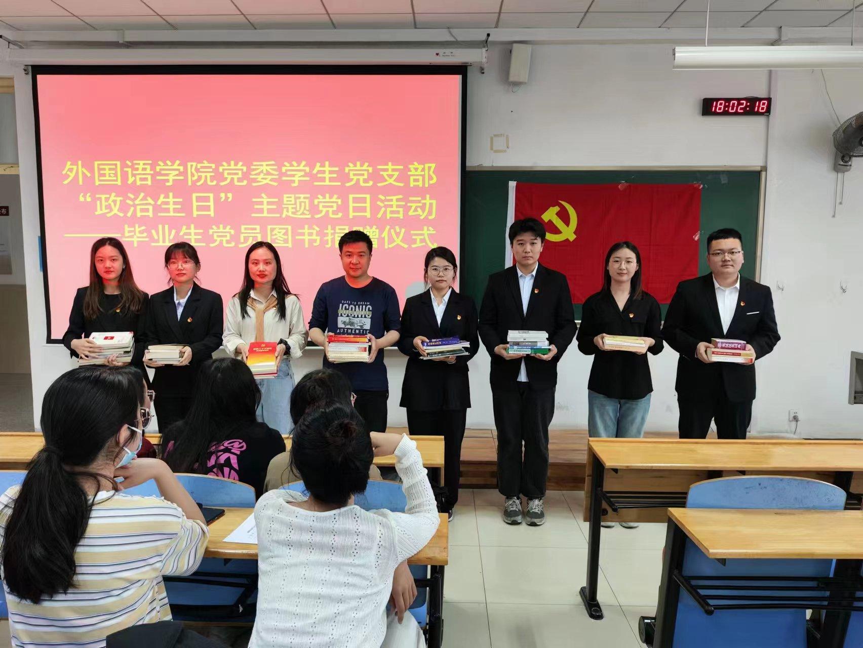 外国语学院学生第一党支部、学生第二党支部开展“政治生日”主题党日活动,全体学生党员参加活动。学生第一党支部书记滕昆、学生第二党支部书记孙文静为5月份过“政治生日”的39名党员,赠送“政治生日”贺卡,勉励全体党员不忘入党初心、牢记职责使命,继续发挥好党员的先锋模范作用。全体党员共同学习了《中国共产党章程》,面向党旗重温入党誓词,并为菏泽市成武县汶上集镇史庄村党支部捐赠了图书,作为“政治生日”献礼。学生党员代表分享了入党经历、入党以来的感受和体会,并许下“政治生日”愿望。