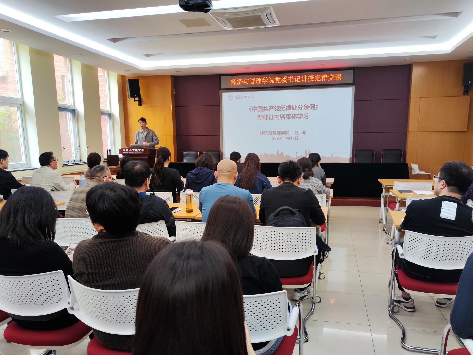 经济与管理学院党委书记赵晖以“学习《中国共产党纪律处分条例》新修订内容”为主题,围绕《中国共产党纪律处分条例》的修订意义、修订内容、贯彻执行等方面进行了重点讲解。他强调,全体党员要筑牢思想基础,在党规党纪面前知敬畏、守规矩,把全面从严治党的各项工作落到实处,切实发挥好党员带头示范作用,以严明的工作纪律和务实的工作作风为学院发展贡献智慧和力量。