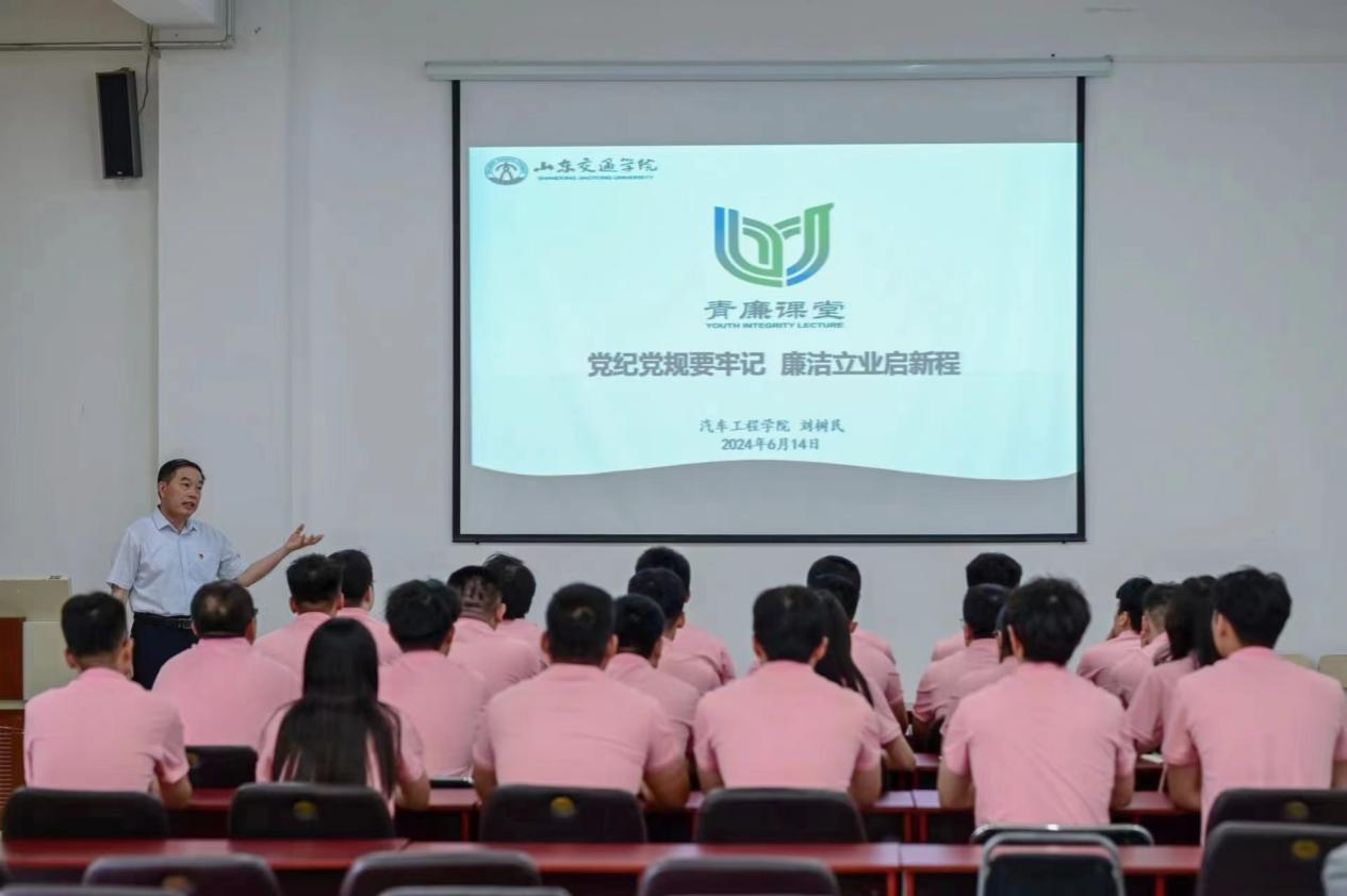 汽车工程学院党委开展讲纪律党课活动暨“青廉课堂”活动。学院党委书记刘树民以《党纪党规要牢记 廉洁立业启新程》为题为学院2024届毕业生党员讲授纪律党课,他从“《中国共产党纪律处分条例》的历史沿革、修订的重要意义、调整范围及重点内容”等四个方面对《中国共产党纪律处分条例》进行深入讲解。他强调,党纪党规是全体党员必须遵守的行为准则,全体毕业生党员要时刻把廉洁从业作为首要政治品质,谦虚谨慎、不骄不躁,艰苦奋斗、行稳致远,在新时代建设中贡献青春力量。