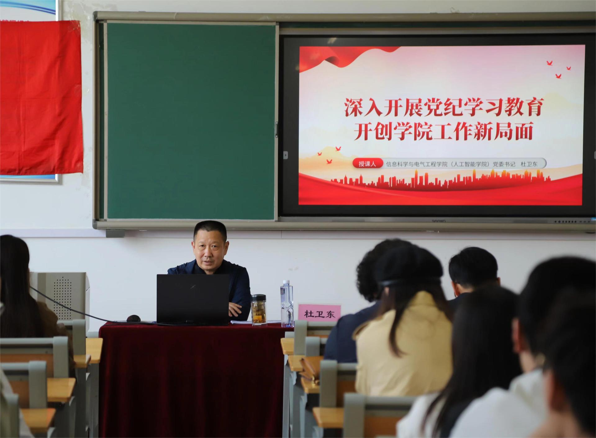 信息科学与电气工程学院(人工智能学院)党委书记杜卫东为全体师生党员讲授纪律党课。他以“深入开展党纪学习教育,开创学院工作新局面”为主题,从“党纪学习教育的深刻意义”“党纪学习教育的目的”“党纪学习教育的目标要求”“开展党纪学习教育与自我革命的关系”及“开创学院工作新局面”等5个方面,讲授了一场内容丰富的专题党课,让师生党员在思想上受触动、在行动上受指引,将党规党纪落实到平时的工作学习当中。