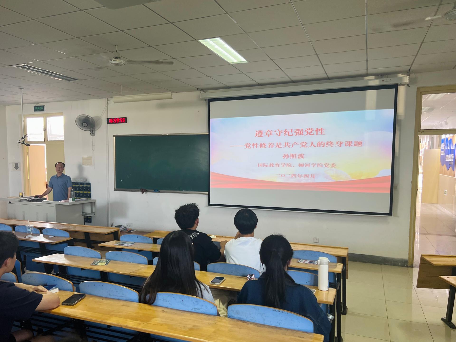 国际教育学院、顿河学院党委书记孙照波在长清二号教学楼2B501教室为全体学生党员讲授纪律党课。他以《遵章守纪强党性——党性修养是共产党人的终身课题》为题,领学了《中国共产党纪律处分条例》的主要内容,阐述了学习党章党纪与加强党性修养的重要性,并勉励全体学生党员,要学纪、知纪、明纪、守纪,将党规党纪规定转化为日常习惯和自觉遵循,积极投身中国式现代化建设的伟大事业中。