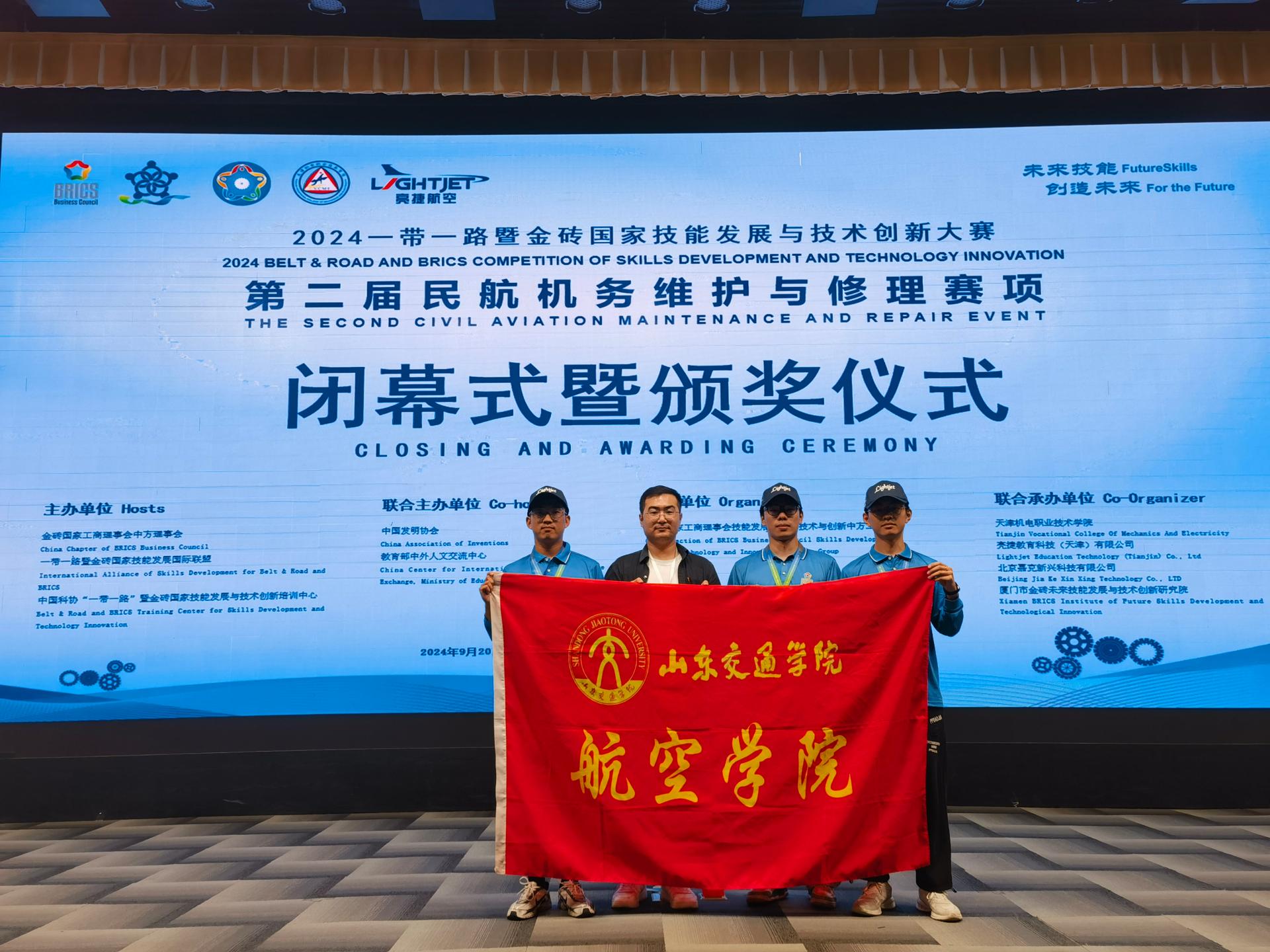 9月20日至22日,2024一带一路暨金砖国家技能发展与技术创新大赛之第二届民航机务维护与修理赛项在天津机电职业技术学院举行。我校航空学院学生团队(参赛学生:应凯旋、牟正豪、李洋,指导教师:李雨林 孙晨)荣获全国二等奖。