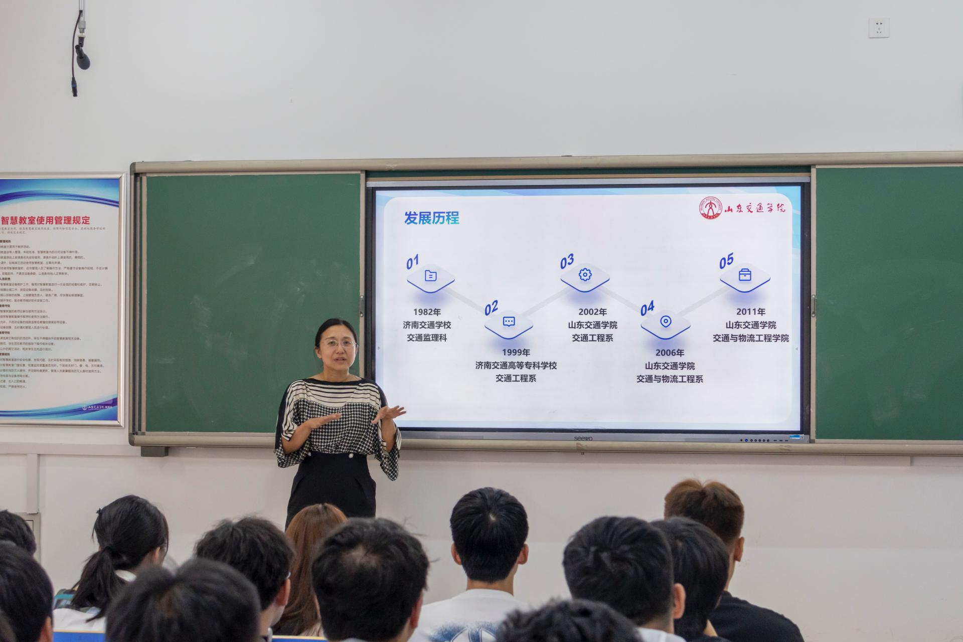 交通与物流工程学院在机电楼A座举办“交通报国 强国有我”专题讲座,学院院长张萌萌担任主讲嘉宾,2024级新生参加活动。张萌萌讲述了我国交通事业的发展成就,分享了学校在国家交通事业建设中的杰出贡献。她详细介绍了学院的发展历程、学科专业、师资队伍、人才培养、实践平台、学术科技和国际交流等,并讲述了交通行业优秀校友事迹,鼓励大家以优秀校友为榜样,坚定理想信念、努力勤奋学习、勇于担当作为,用过硬的专业本领和脚踏实地的实际行动践行交通报国使命,为交通强国建设贡献力量。