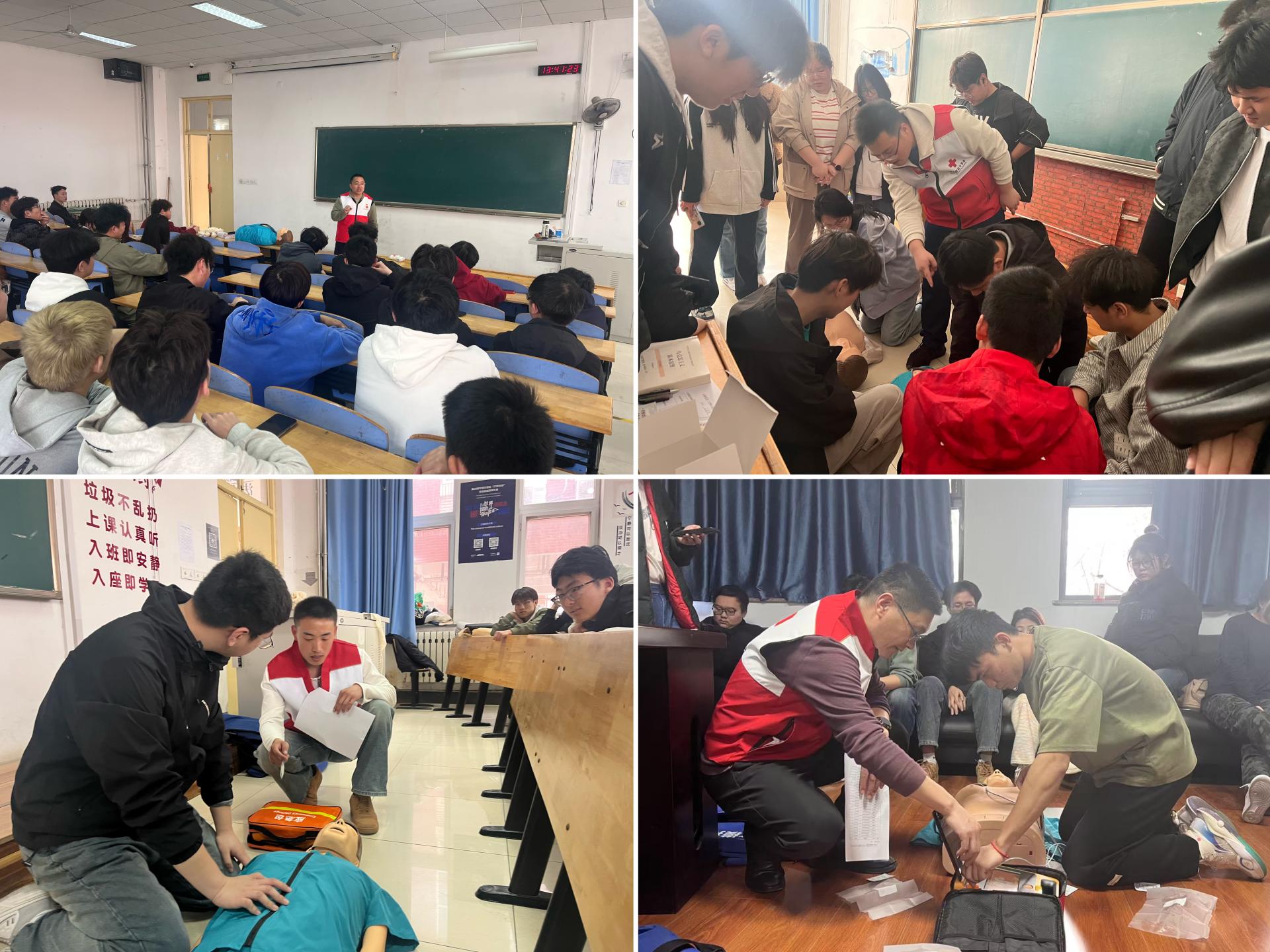 学校团委联合长清区红十字会举办“‘救在身边 校园守护’应急救护教育进校园”活动,学校300余名学生参加。工作人员讲解示范了心肺复苏、创伤救护和海姆立克急救法等实用技能,并进行规范化演示;同学们在工作人员的指导下,完成心肺复苏与 AED 联动施救操作,增强自身的健康安全意识和急救责任意识。
